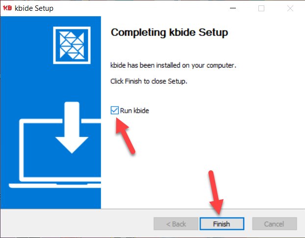เมื่อโปรแกรมติดตั้งเสร็จแล้ว หน้าต่างติดตั้งจะแสดงดังรูป ให้กดในช่องสีเหลี่ยมหน้า Run kbide ให้ขึ้นเครื่องหมายถูก (ดังรูป) เพื่อเลือกให้เปิดโปรแกรมทันทีหลังปิดหน้าต่างการติดตั้งนี้ จากนั้นกดปุ่ม Finish เพื่อปิดหน้าต่างติดตั้ง