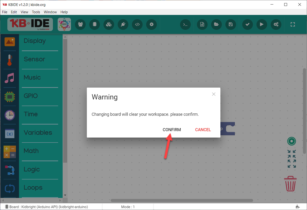 จากนั้นโปรแกรมจะแจ้งเตือนว่าโค้ดโปรแกรมที่เขียนไว้จะถูกลบทิ้งเมื่อเปลี่ยนบอร์ด ให้กดปุ่ม CONFIRM เพื่อยืนยันการเปลี่ยนบอร์ด
