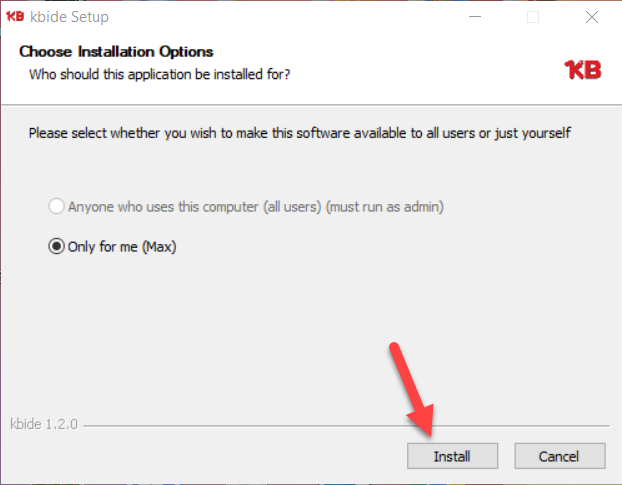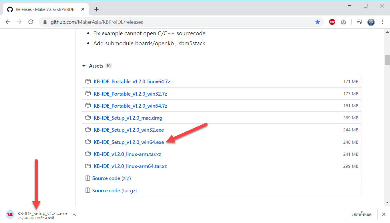 ให้เข้าไปดาวน์โหลดไฟล์ติดตั้งโปรแกรม KBIDE ได้ที่ https://github.com/MakerAsia/KBProIDE/releases โดยเลื่อนไปที่เวอร์ชั่นล่าสุด (ขณะที่เขียนบทความนี้ เวอร์ชั่นล่าสุดคือ 1.2.0) เลือกดาวน์โหลดไฟล์ติดตั้งตาม OS ที่ใช้งาน (ผู้เขียนบทความใช้ Windows 10 เวอร์ชั่น 64 บิต จึงเลือกดาวน์โหลดไฟล์ KB-IDE_Setup_v1.2.0_win64.exe) รอจนดาวน์โหลดไฟล์เสร็จ