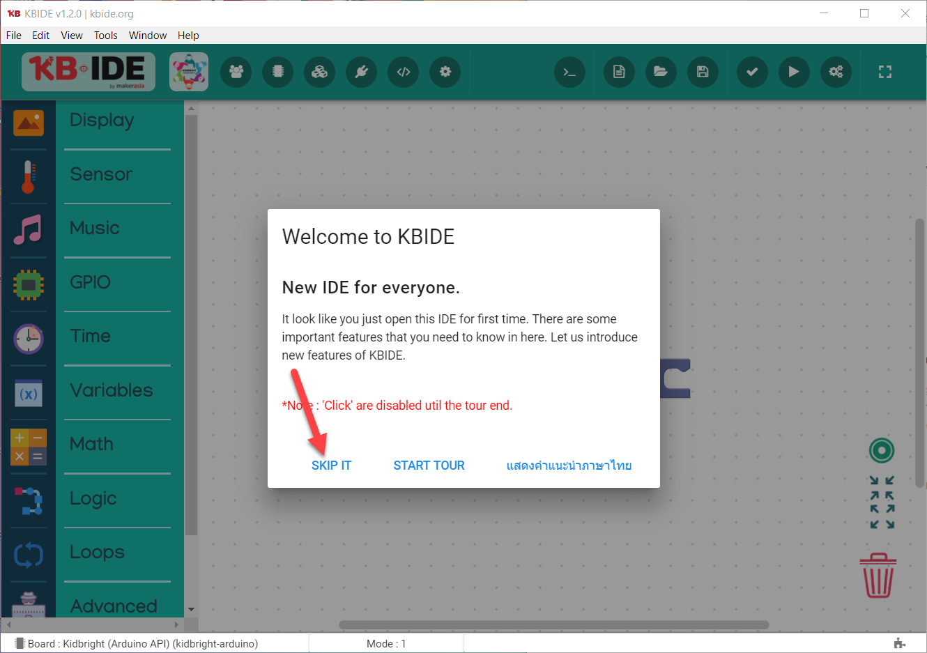 โปรแกรม KBIDE จะเปิดขึ้นมา พร้อมมีกล่องข้อความแนะนำการใช้งาน หากต้องการให้โปรแกรมช่วยแนะนำการใช้งาน ให้กดที่ปุ่ม START TOUR หากไม่ต้องการให้แนะนำ กด SKIP IT