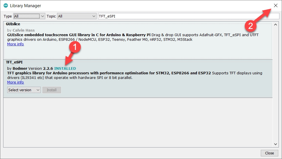 เมื่อติดตั้งเสร็จแล้ว จะแสดงคำว่า INSTALLED (ดังรูป) สามารถปิดหน้าต่าง Library Manager ไปได้เลย
