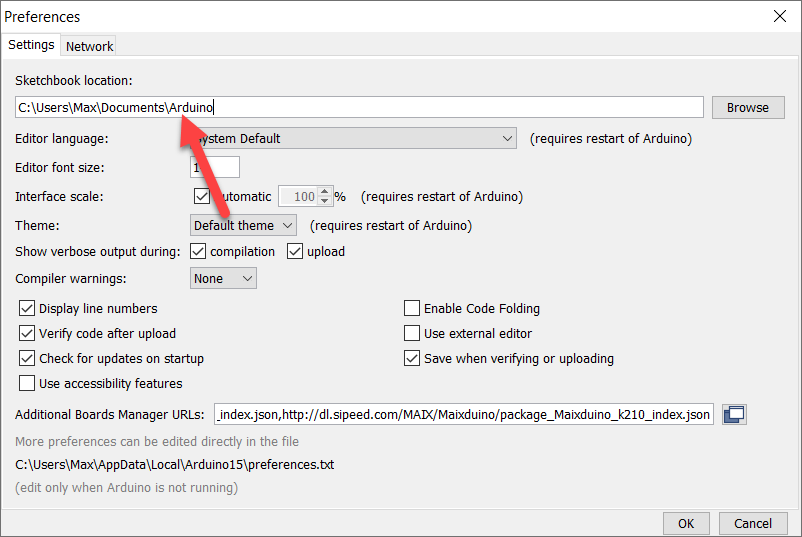 หน้าต่าง Preferences จะเปิดขึ้นมา ให้สังเกตที่อยู่ในช่อง Sketchbook location แล้วเข้าไปที่โฟลเดอร์ตามที่ Sketchbook location แสดง