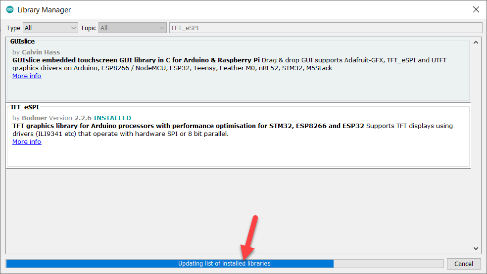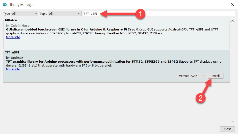 หน้าต่าง Library Manager จะเปิดขึ้นมา ในช่องค้นหา ให้พิมพ์ TFT_eSPI เลือกไลบารี่ TFT_eSPI แล้วกดปุ่ม Install