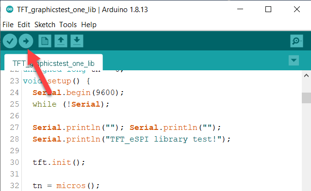 กดอัพโหลดโปรแกรมตัวอย่าง TFT_graphicstest_small ลงบอร์ดไปได้เลย