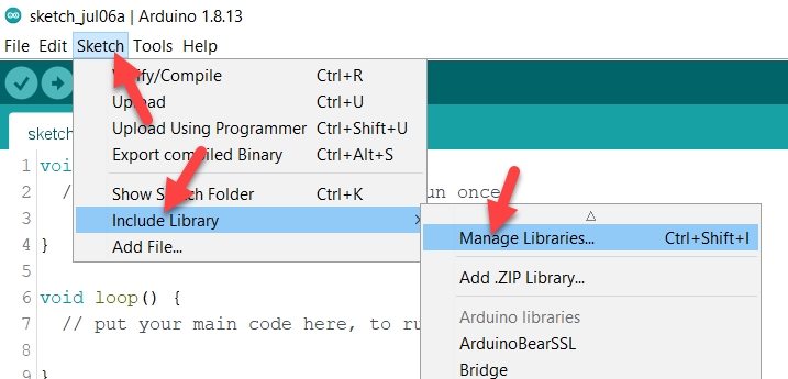 เปิดโปรแกรม ArduinoIDE ขึ้นมา จากนั้นกดไปที่ Sketh > Include Library เลือก Manage Libraries…
