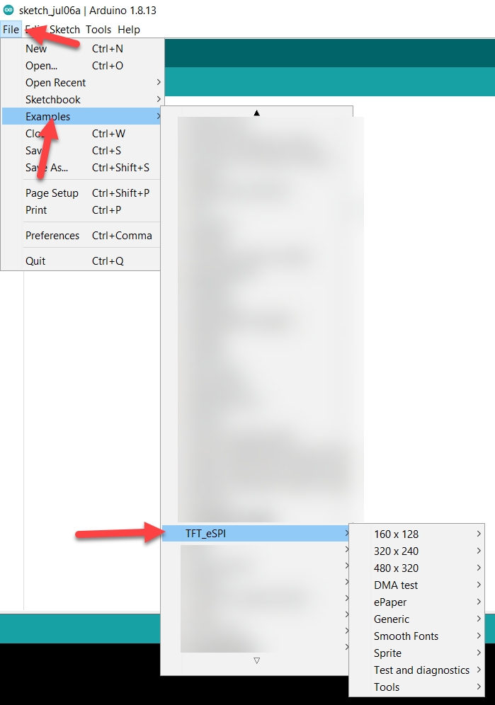 ตรวจสอบผลการติดตั้งไลยบารี่ TFT_eSPI ได้ โดยกดไปที่ File > Examples หากมีรายการ TFT_eSPI แสดง แสดงว่าติดตั้งไลบารี่สำเร็จแล้ว